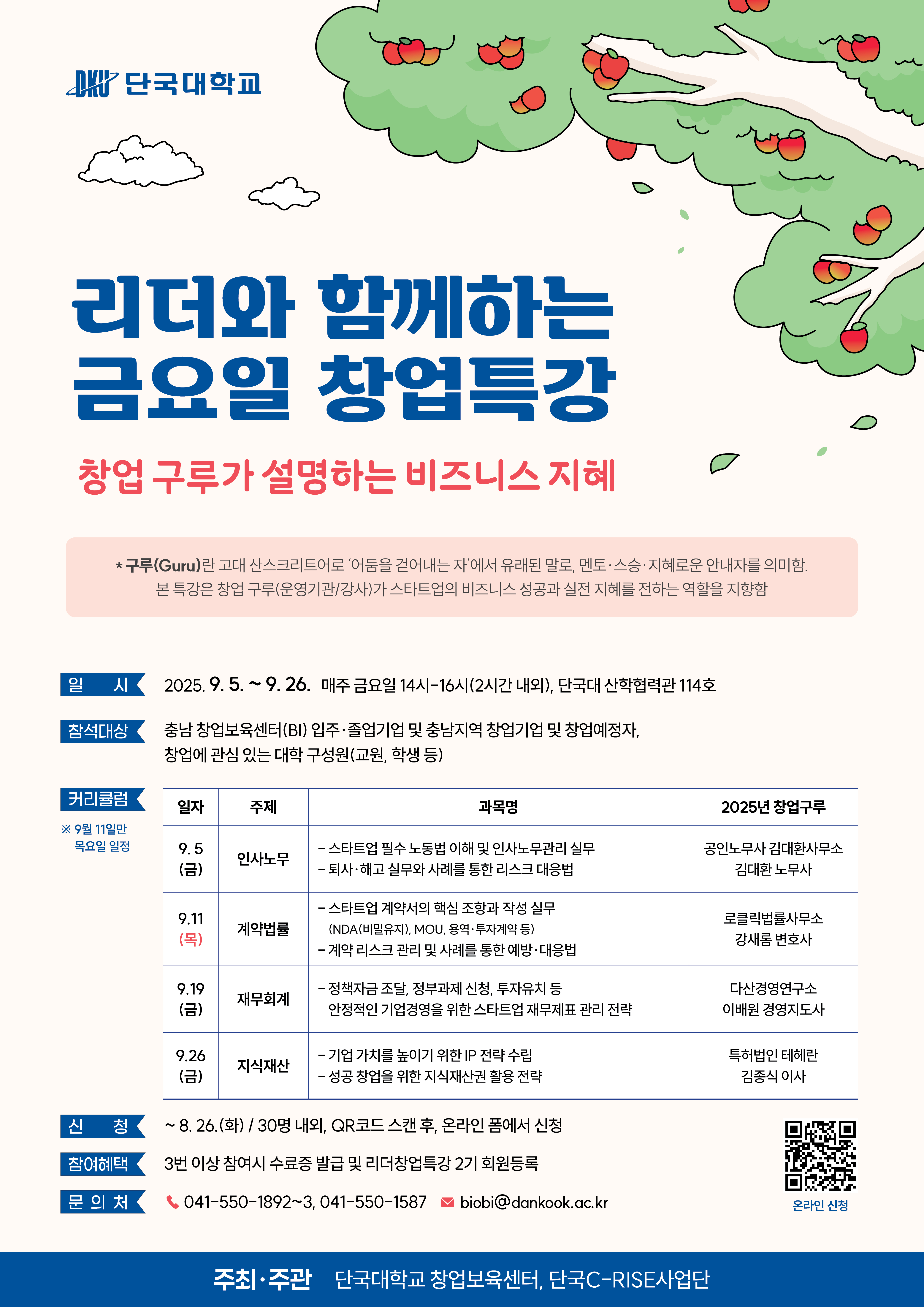본 특강은 창업 구루(운영기관/강사)가 스타트업 비즈니스를 위해 분야별 실전 지혜를 나눔으로써 기업의 성장을 도모하고 성공적인 비즈니스 기반 마련을 지원하는 프로그램입니다. 사례를 통한 대응법, 기존 사업의 고도화 팁 등이 있는 특강이므로 많은 관심과 신청을 부탁드립니다. • 모집기간 : ~ 2025. 08. 26(화) / 마감 이후 신청자는 빈자리 발생 시 연락 • 일시 : 2025. 09. 05. ~ 09. 26. / 매주 금요일 14시~16시(2시간 내외)(2회차만 목요일) • 장소 : 단국대학교 천안캠퍼스 산학협력관 • 참여혜택 : 3번 이상 참여시 수료증 발급 및 리더창업특강 2기 회원등록 • 문 의 처 : 단국대학교(천안) 창업보육센터, 단국C-RISE사업단 - 041-550-1892~3, 041-550-1587, biobi@dankook.ac.kr